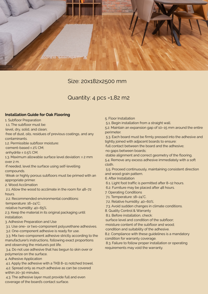 Enhance your interior with the timeless beauty of solid oak flooring. Crafted from high-quality oak, it combines lasting durability, strength, and the natural charm of real wood.