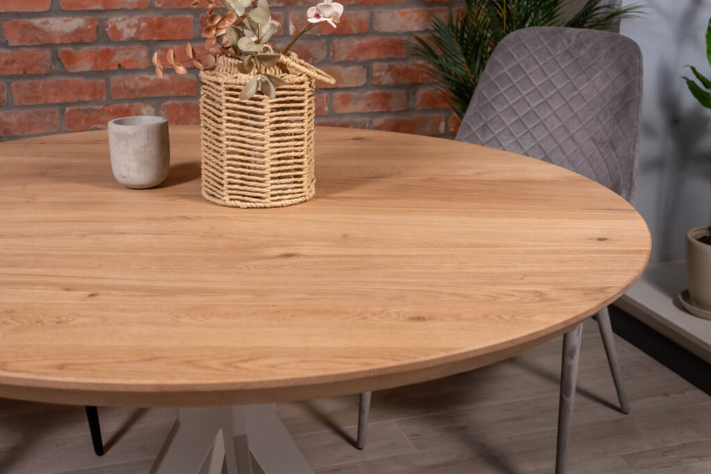 The oak tabletop combines natural beauty, strength, and durability. Its rich, warm tone and pronounced texture add coziness and elegance to any interior.