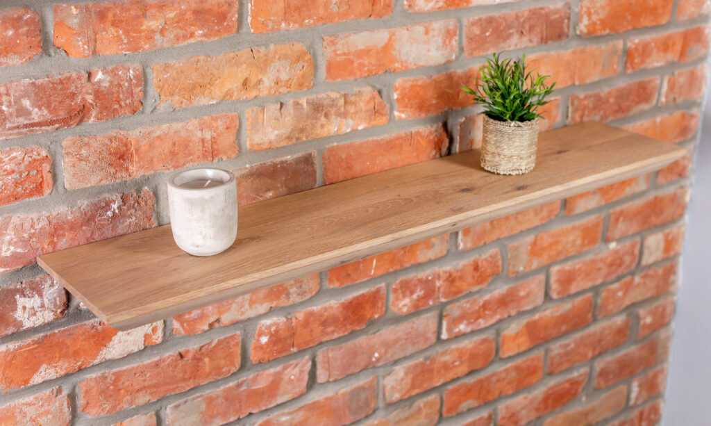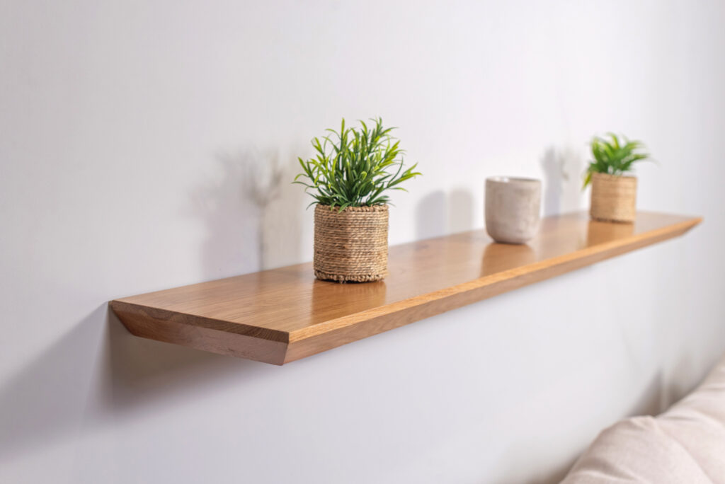 The oak wall shelf is made from carefully selected solid oak, providing high strength, durability, and a natural aesthetic. Neatly crafted notches for hidden brackets ensure a secure and visually clean installation.
