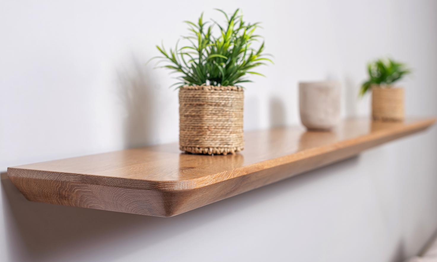 The oak wall shelf is made from carefully selected solid oak, providing high strength, durability, and a natural aesthetic. Neatly crafted notches for hidden brackets ensure a secure and visually clean installation.